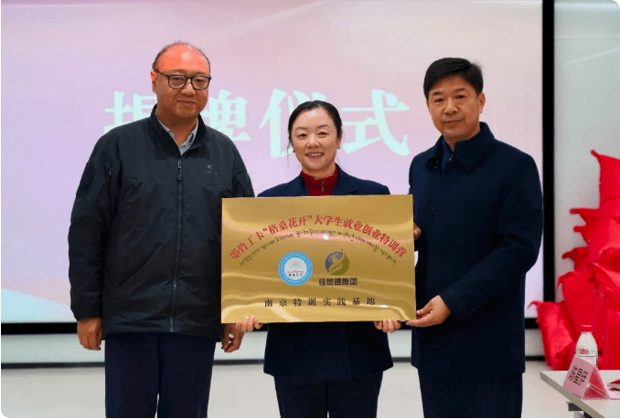 活动现场举行了墨竹工卡县"格桑花开"大学生就业创业特训营南京特训实践基地揭牌仪式。南京市人社局副处长万金海与墨竹工卡县副县长岳靓共同揭牌,标志着宁墨两地就业协作迈向机制化、常态化新阶段。佳世德集团总经理宋晓平代表集团接受授牌,未来将承担实践基地的具体运营工作,为特训营学员提供持续的就业创业服务。